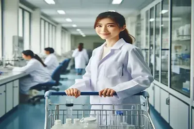 Une chimiste utilise un chariot de laboratoire pour le transfert